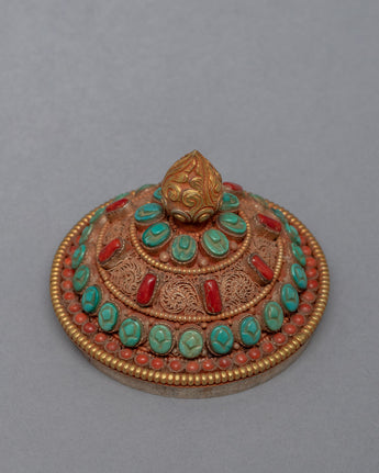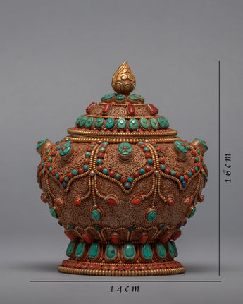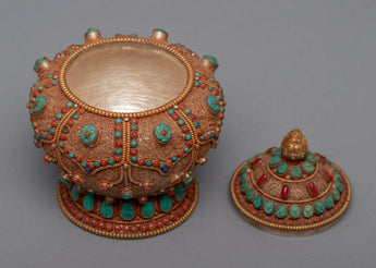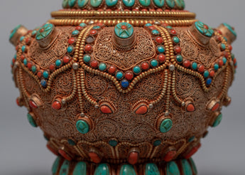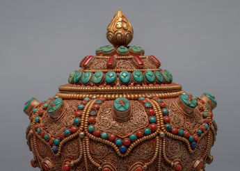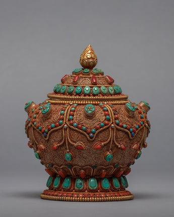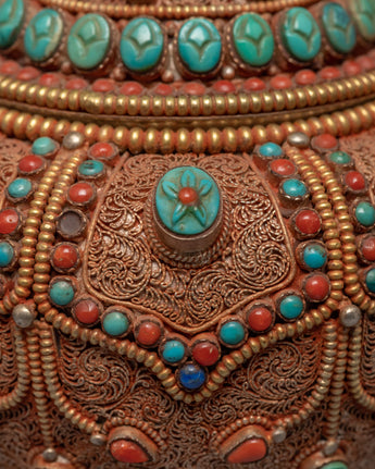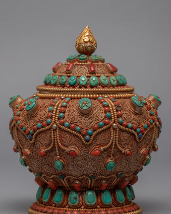 Gulpa Filigree Embed Turquoise, Red Coral, Lapis & Gem Stones | Buddhist Tank Jar