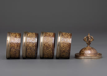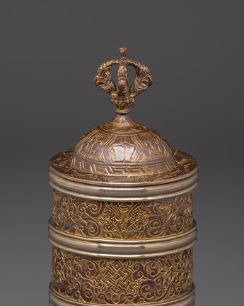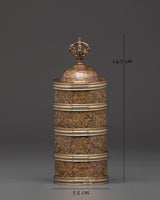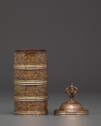 This traditional, handcrafted copper and brass rice pot is ideal for ritual offerings, religious events, and home decor. This exquisite rice pot, measuring 14.5 cm in height and 5.5 cm in width, is crafted from a blend of copper and brass, offering spirituality, longevity, and a timeless appeal. Its smooth, polished surface and traditional shape make it an ideal receptacle for storing rice grains during Buddhist rituals, Hindu pujas, or as a lovely ornamental element in conventional kitchens and sacred areas.