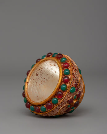 This stunning handcrafted copper ritual offering bowl, embellished with colorful coral and turquoise artificial stones, will elevate your altar space. The bowl exhibits traditional filigree metalwork and is delicately gold-plated, showcasing the elaborate elegance of Himalayan handicraft. A significant addition to any spiritual or meditative setting, this sacred bowl represents dedication, beauty, and cultural history and is used in Buddhist rituals for offering-making.