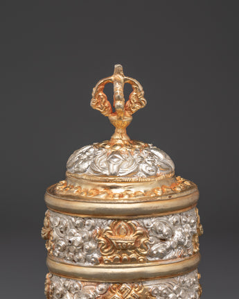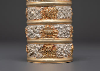 This handcrafted Tibetan Buddhist rice pot is a stunning example of Tibetan culture and spirituality. It is expertly crafted from a combination of copper, gold-plated, and silver-plated materials, serving as a magnificent vessel for ritual offerings or an ornament for your altar. The design features elaborate elements that represent balance, harmony, and the spiritual path. Standing 17cm tall, it combines elegance and spiritual meaning, making it an excellent addition for introducing sacred energy to any meditation space.