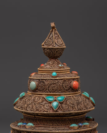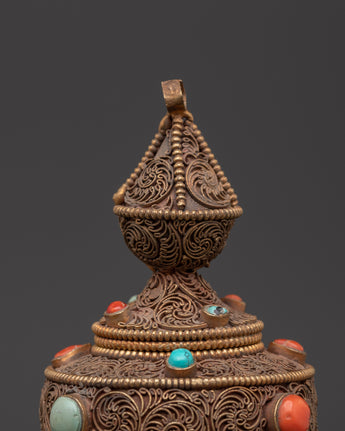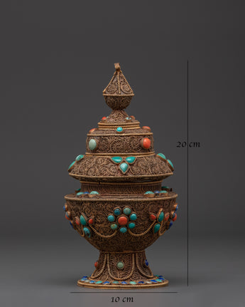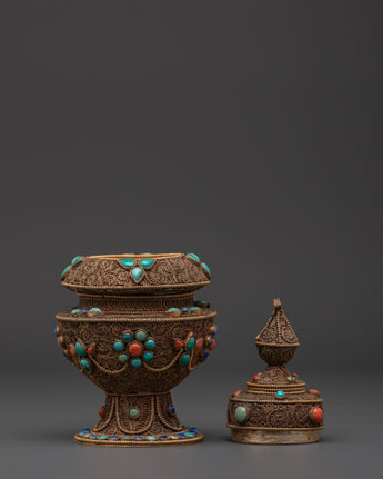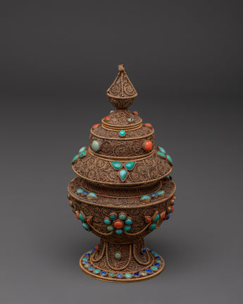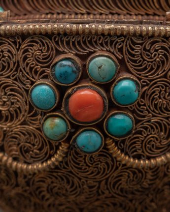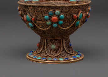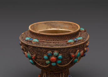 This handcrafted Tibetan Filigree Rice Pot is a stunning example of traditional Tibetan craftsmanship. This elegantly designed rice pot, measuring 20 cm in height and 10 cm in diameter, is ideal for adding an authentic touch to your home, altar, or spiritual space. This rice pot's beautiful filigree work and gold-gilded copper construction make it a stunning decorative object. At the same time, the coral and turquoise inlays add bright accents that represent protection and blessings.