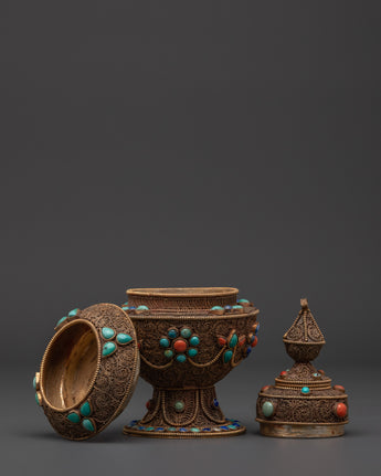 This rice pot is crafted from copper and meticulously gilded with gold, enhancing its visual appeal and producing a rich, antique-like appearance. The colorful artificial stones, coral, and turquoise are precisely positioned to highlight the spiritual and aesthetic characteristics of this artwork. Weighing 0.59 kg, it has a significant yet graceful presence that makes it suitable for any ceremony, altar, or sacred area.