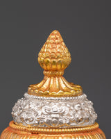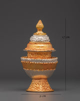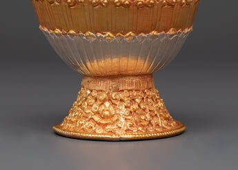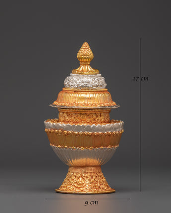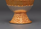 The beautiful design features layered textures and precise detail work, resulting in a pointed lid that represents a focused and wealthy outlook. The gold plating denotes divine illumination and purity, and the silver symbolizes clarity and wisdom. This cup is ideal for puja rituals, prayer ceremonies, and as a devotional centerpiece to brighten any sacred environment. Whether you're a practitioner, collector, or spiritual gift-giver, this handcrafted pot radiates reverence and tradition.
