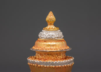 This Himalayan Buddhist Ritual Pot is an essential ceremonial vase used in Tibetan and Himalayan traditions to contain offerings of rice, grains, and other blessed goods. This pot, crafted from copper and electroplated with gold and silver, embodies both profound spiritual symbolism and exquisite beauty.. It measures 17cm in height and 9cm in width, weighing 0.43kg, making it ideal for personal altars, temple settings, and ceremonial use.