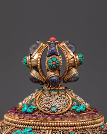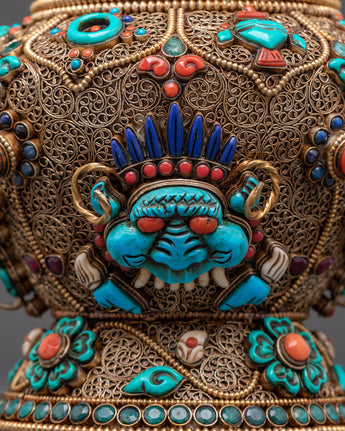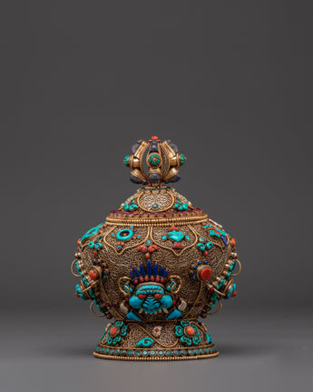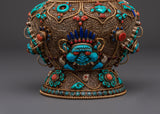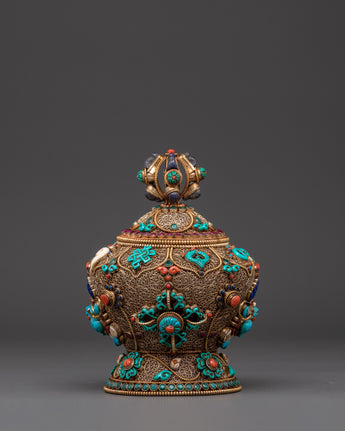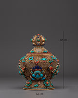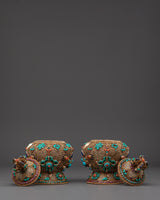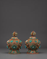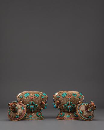 Each pot in this set is handcrafted from copper and beautifully plated in silver and gold, creating a stunning appearance that represents spiritual purity and enlightenment. The exterior is expertly inlaid with natural gemstones, including turquoise, coral, and lapis lazuli, each chosen for its profound spiritual significance. Turquoise provides healing energy and protection, while coral promotes vitality and balance. Lapis Lazuli improves spiritual awareness and communication. The pair measures 20cm in height and 14cm in width, weighing 0.86kg each, for a total of 1.73kg. This makes a strong visual and energetic presence on your altar or as a display item.