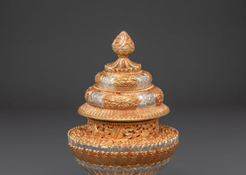 The Himalayan Handcrafted Rice Pot is an excellent combination of ethnic craftsmanship and spiritual significance. This pot, crafted from copper, gold-plated, and silver-plated materials, embodies the rich heritage of Himalayan craftsmanship. It's more than just an item, with intricate designs and fine finishes that represent the sacred traditions of the Himalayan region. This rice pot, measuring 22 cm in height and 12.5 cm in diameter, adds a distinctive and significant touch to any room, whether for rituals, home decor, or a spiritual sanctuary.