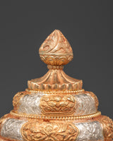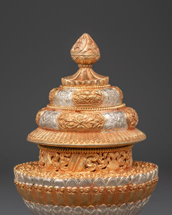 The Himalayan rice pot features artistically engraved designs that represent prosperity and harmony. Every element embodies the blessings of prosperity and tranquility. The gold and silver plating accentuate the richness of the copper, creating a striking focal point in any environment. This piece holds great significance in Himalayan rites, as it is frequently used to represent offerings and spiritual connections.
