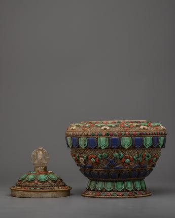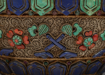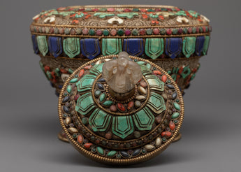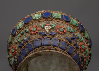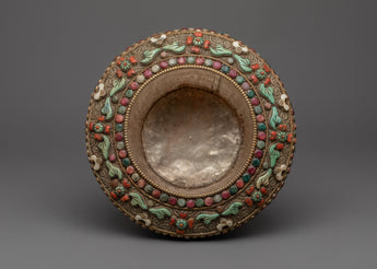 With the Dhupur Offering Pot, a masterpiece of artistry and tradition, enter the world of Tibetan rituals. This pot is delicately handcrafted on a Body of rich copper and further adorned with inlaid crystal, turquoise, and coral stones. This pot, which measures 29 cm in height by 25 cm in width and weighs a substantial 3.04 kg, is not only a necessary item for ritual use but also a piece of art that tells stories of craftsmanship and tradition.