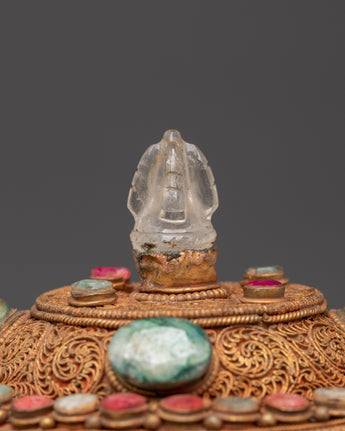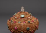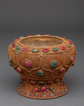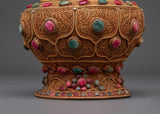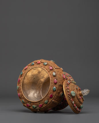 The pot has complex filigree work and is elegantly embellished with imitation turquoise and coral stones, both of which have strong symbolic meaning in Himalayan traditions. Turquoise is associated with healing and spiritual harmony, whereas coral is viewed as a protective stone that represents life energy. This combination of materials, artistry, and meaning elevates the rice pot from a ceremonial object to a stunning piece of religious décor.