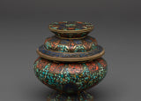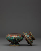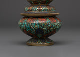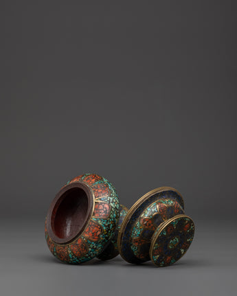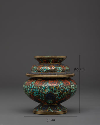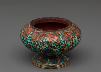 Elevate your spiritual rituals with this Handmade Sacred Rice Pot, an artifact deeply rooted in Tibetan Buddhist tradition. Expertly crafted from copper, this small vessel serves as a powerful offering bowl used during pujas and blessings, symbolizing devotion and reverence. Adorned with exquisite inlays of lapis lazuli, turquoise, and coral, each stone carries profound symbolic meaning, enhancing both the pot’s spiritual significance and visual appeal. Measuring 9.5 cm in height, it fits perfectly on your home shrine, altar, or sacred space, inviting harmony and sacred energy into your daily practice. This pot is an essential addition for anyone seeking to deepen their connection to Tibetan spiritual heritage.