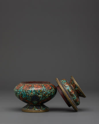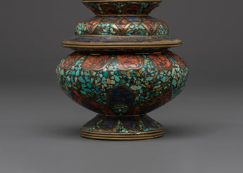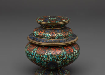 Each Sacred Rice Pot is meticulously handcrafted using time-honored techniques passed down through generations of Tibetan artisans, ensuring authenticity and cultural significance. The copper body is beautifully embellished with genuine stones such as coral, lapis lazuli, and turquoise, each valued for their protective and healing energies. This pot serves a dual purpose: it is both a functional vessel for sacred offerings and a stunning decorative piece that enriches your spiritual environment. Ideal for personal meditation or ceremonial rituals, it symbolizes abundance, purity, and a deep divine connection, making it a meaningful addition to any spiritual practice.
