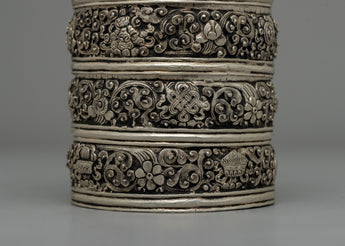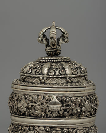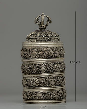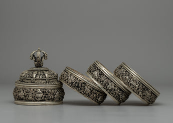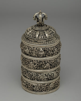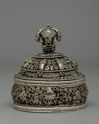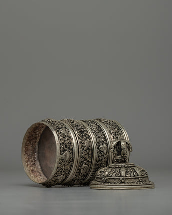 This intricately handcrafted rice pot box, made from a copper body with stunning silver plating, is both a functional and symbolic item in Buddhist culture. This rice pot enhances any space with elegance and historical significance, serving as both an essential and decorative object. Although every pot is meticulously made through hand, an exclusive and superior finish that exhibits the maker's commitment and expertise is secured.