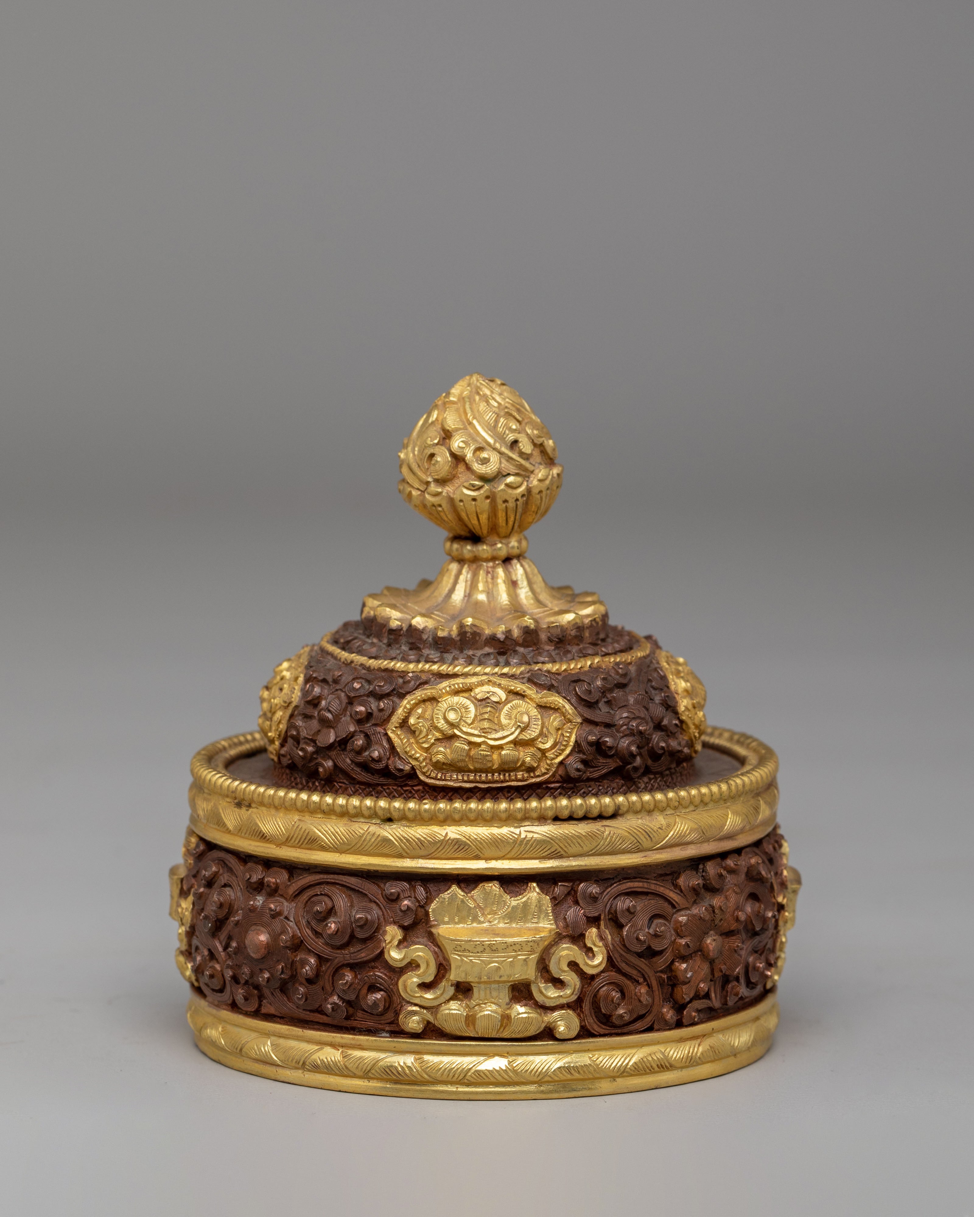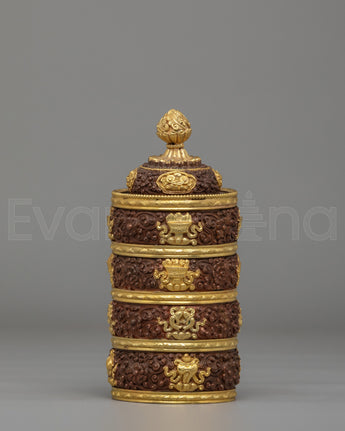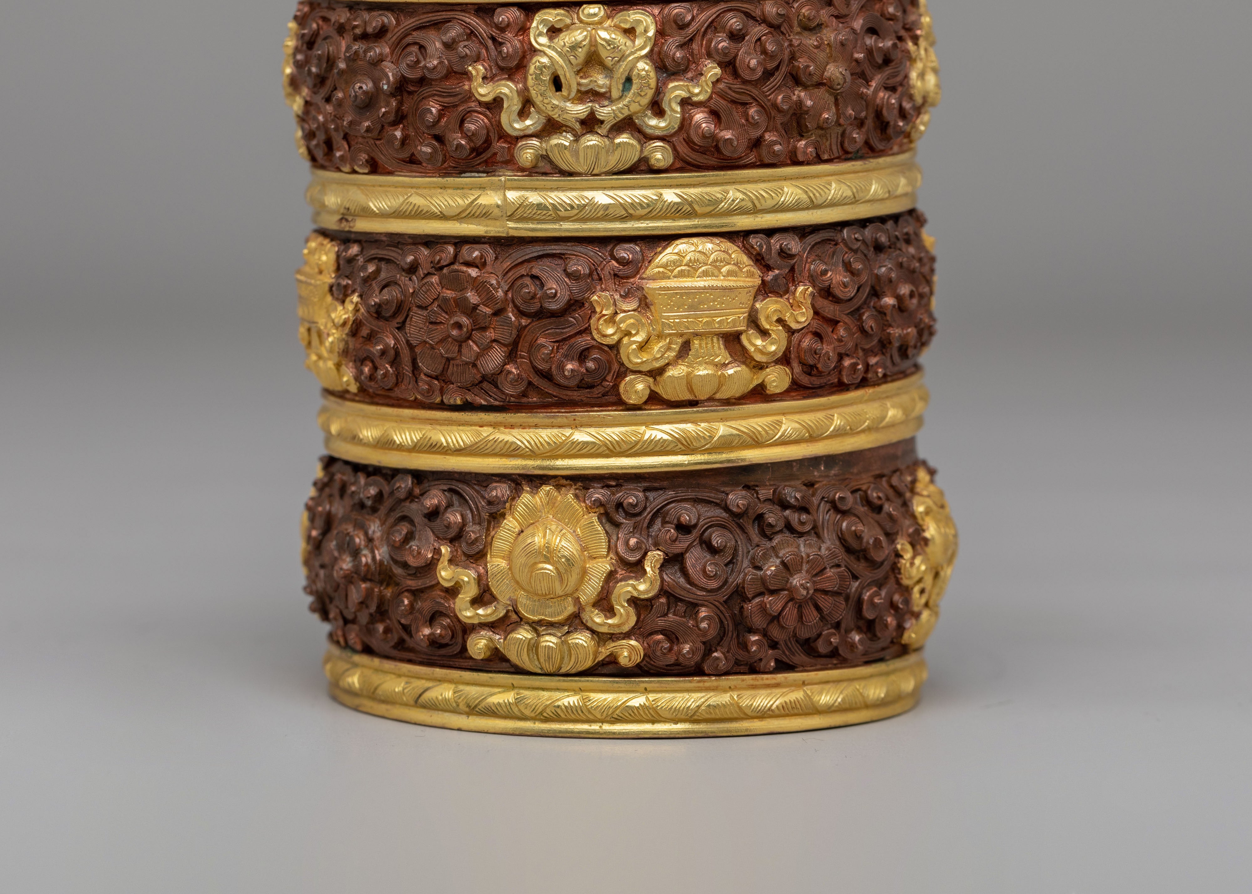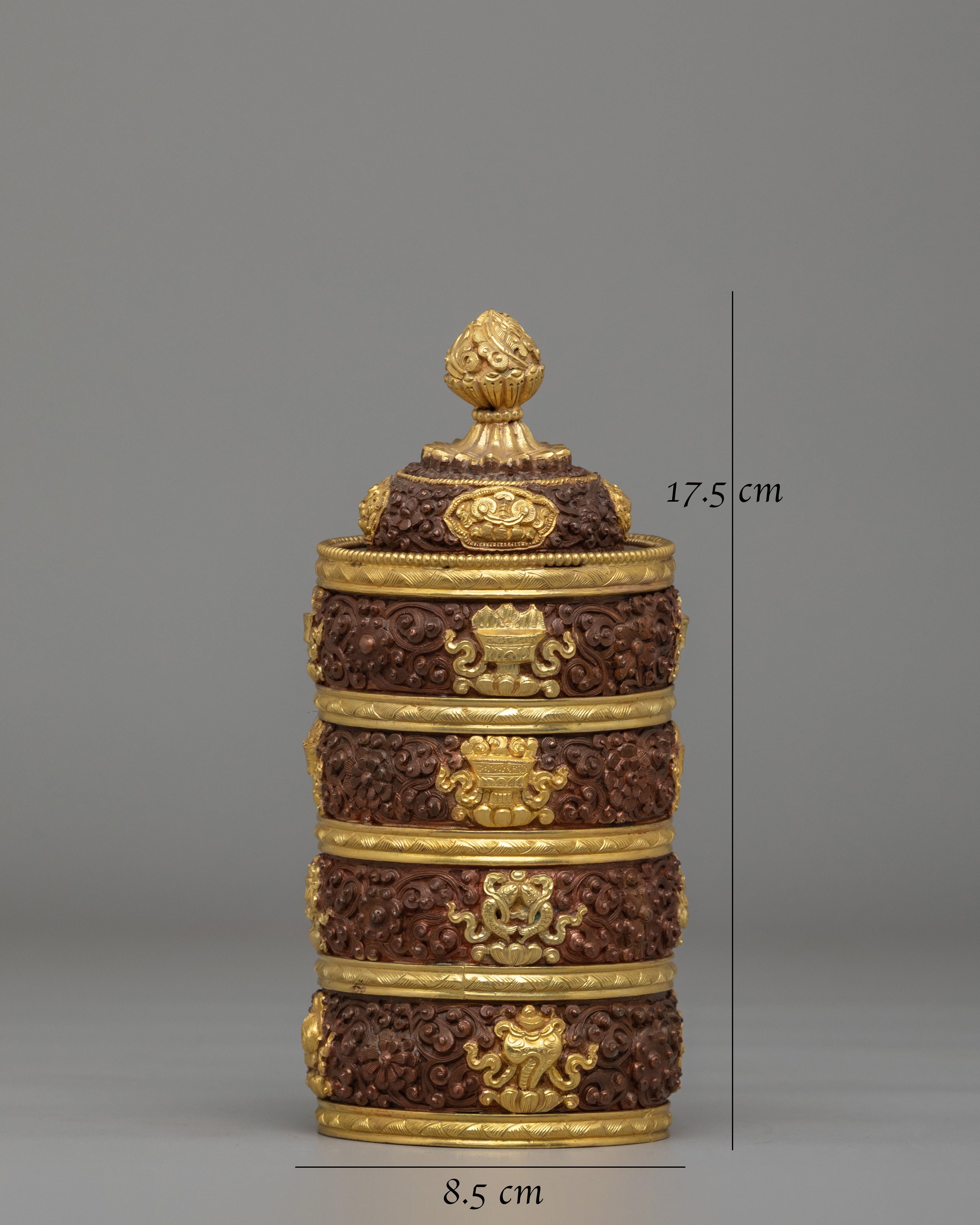This Dhupur Rice Pot features layered bands with intricate carvings and decorative motifs that reflect traditional Himalayan craftsmanship. The textured surface combined with gold accents creates a rich visual contrast, while the lid is topped with a finely shaped handle that completes the design. Each section of the pot is carefully detailed, giving it a refined and sacred appearance suitable for ritual settings.