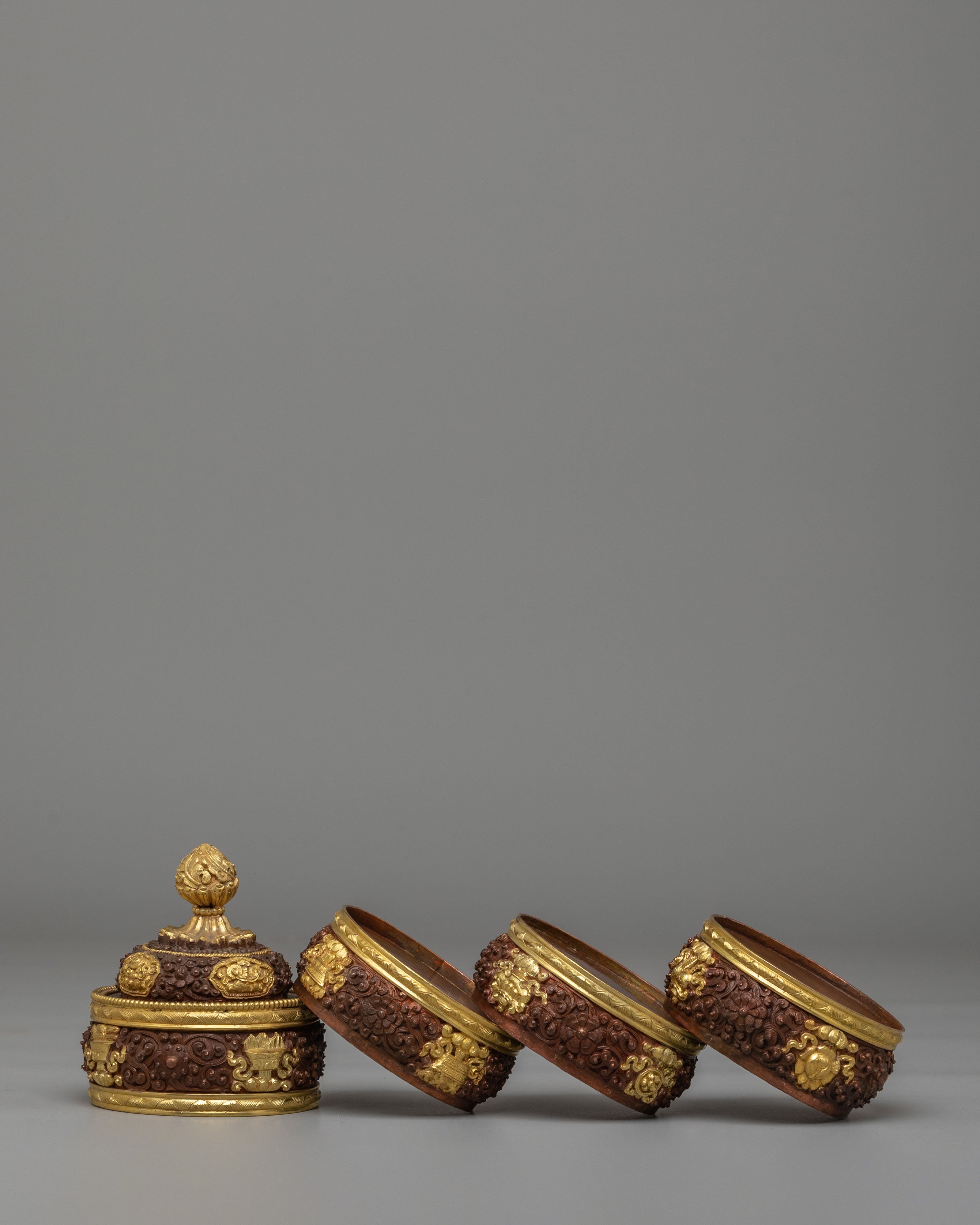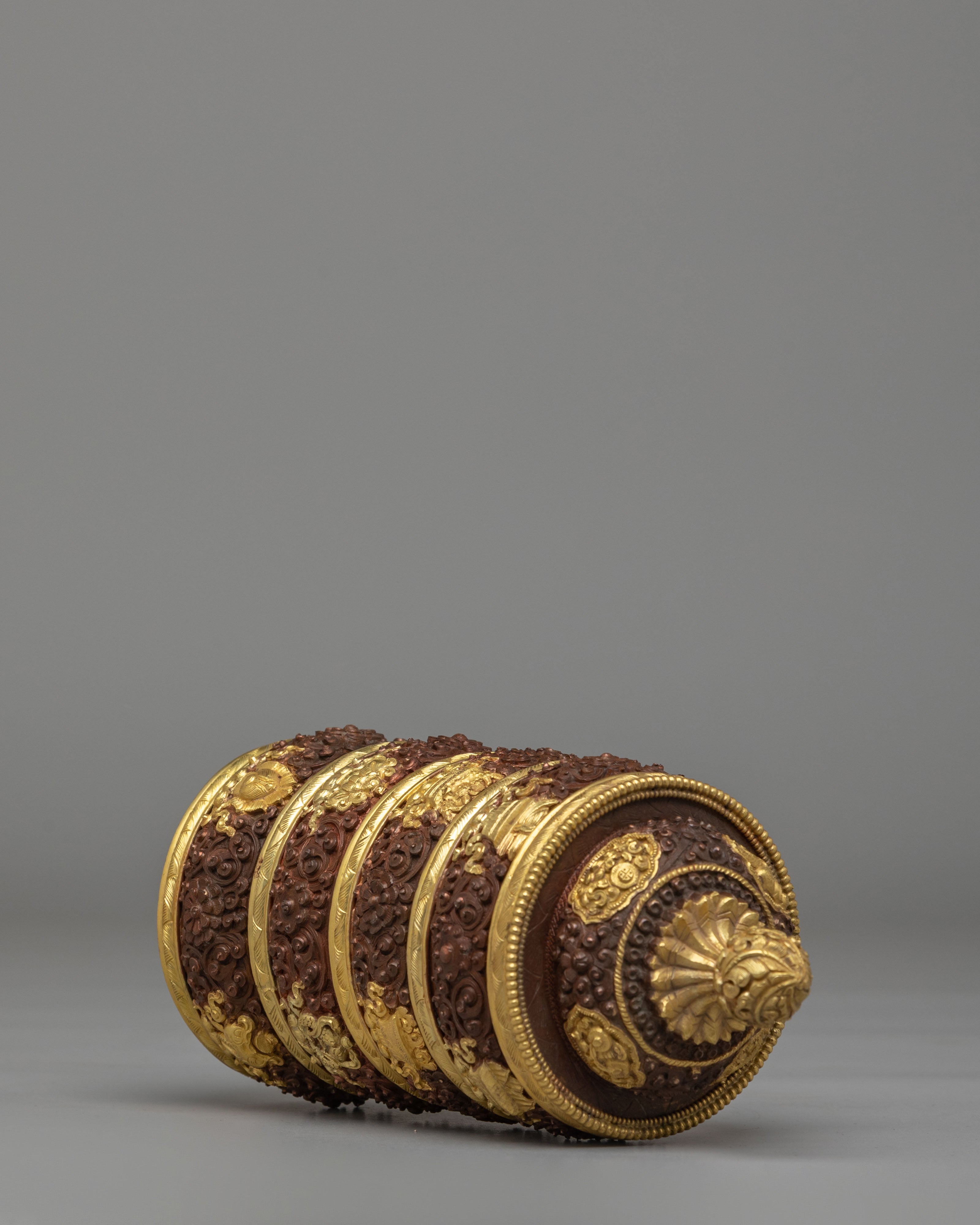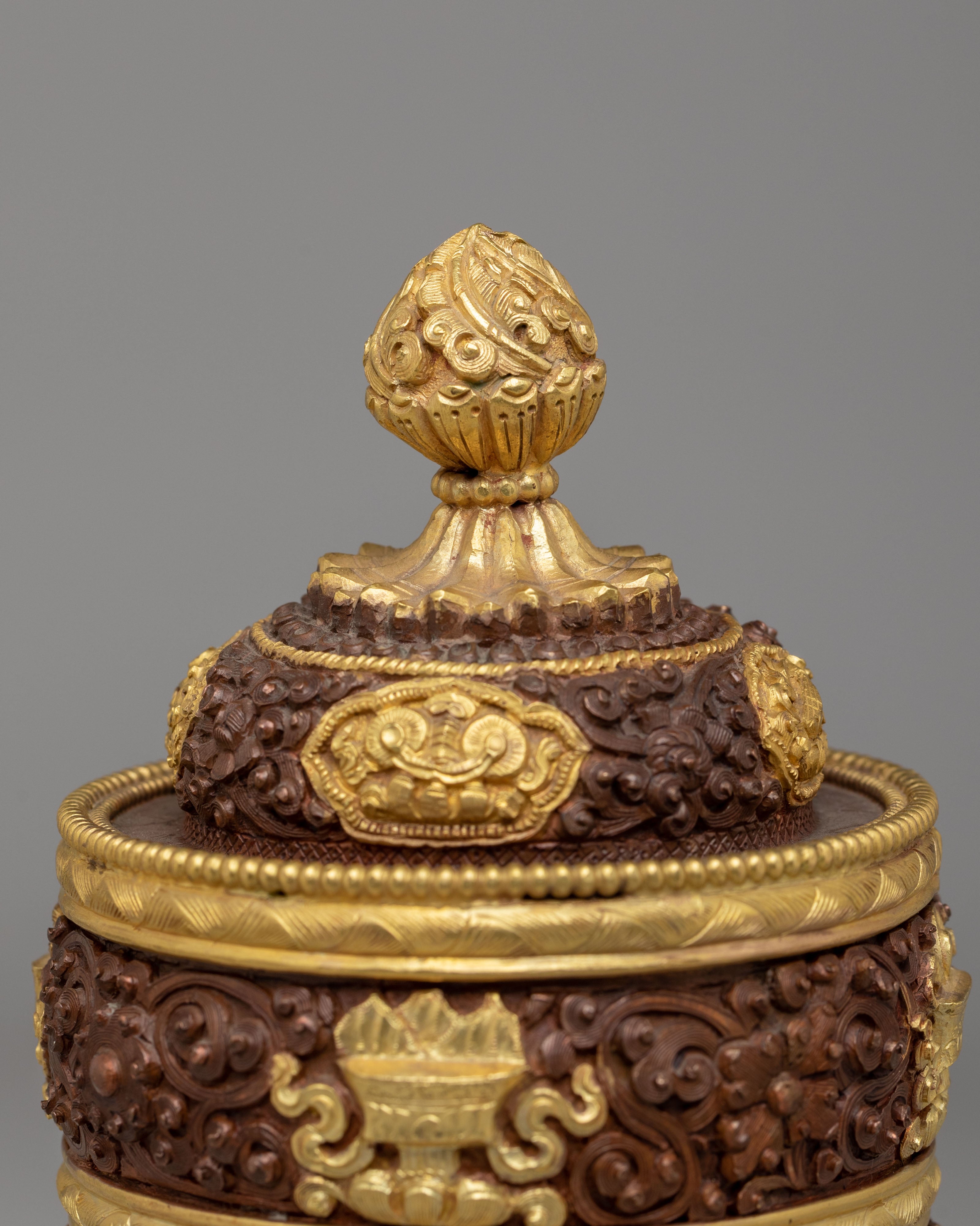 This Dhupur Rice Pot features layered bands with intricate carvings and decorative motifs that reflect traditional Himalayan craftsmanship. The textured surface combined with gold accents creates a rich visual contrast, while the lid is topped with a finely shaped handle that completes the design. Each section of the pot is carefully detailed, giving it a refined and sacred appearance suitable for ritual settings.