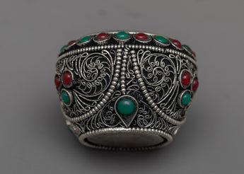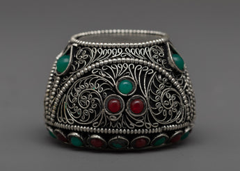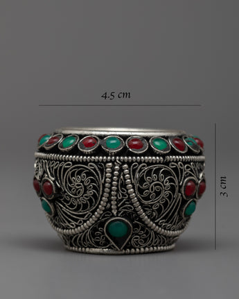 Embrace the harmony and serenity of Tibetan traditions with the handcrafted Tibetan Buddhist Golpa. Meticulously crafted on a sturdy copper body, this enchanting bowl is further elevated with a lustrous silver plating. To enhance its divine allure, delicate rubies and emeralds are exquisitely inlaid, infusing the Golpa with their vibrant energy. Immerse yourself in the mesmerizing tones produced by this sacred singing bowl, and allow its resonant vibrations to cleanse your mind, body, and spirit. Invite tranquility and spiritual connection into your life with this beautiful masterpiece of craftsmanship and ancient wisdom.