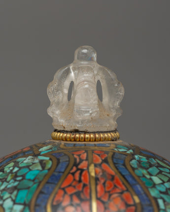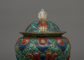 This Tibetan Ceremonial Rice Pot is a handcrafted masterpiece designed for Buddhist ceremonies, holy offerings, and home altars. This ceremonial jar features a copper body adorned with turquoise, coral, and lapis lazuli stones. It measures 19 cm in height and 16 cm in width, has a base of 13 cm, and weighs 1.096 kg. The exquisite inlay work and floral designs make this a visually appealing ceremonial relic, suitable for traditional pujas, meditation spaces, or an attractive home decor piece.