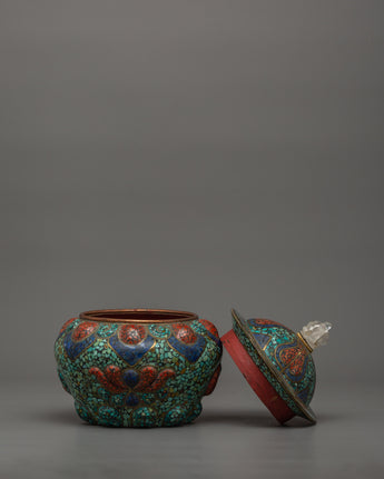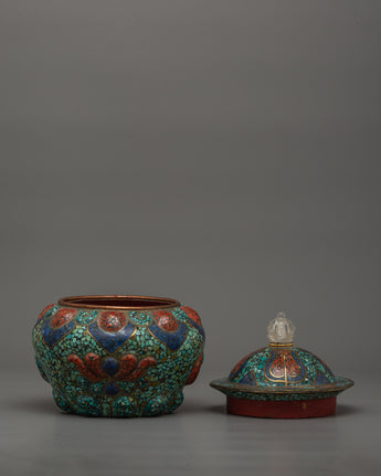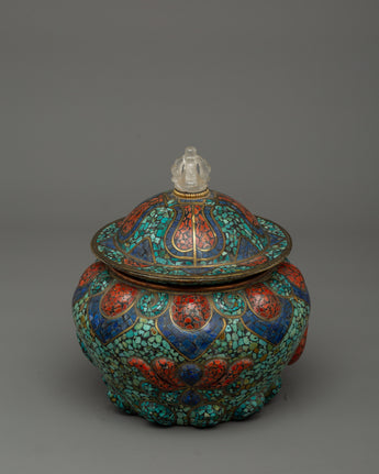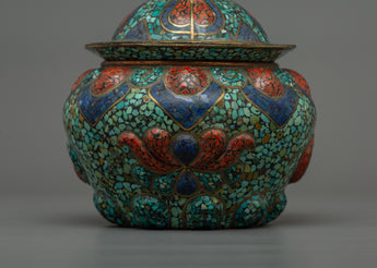In Tibetan Buddhism, rice pots symbolize wealth, abundance, and devotion. The beautiful gemstone inlays carry profound spiritual meaning, as turquoise signifies protection and healing, coral represents vitality and optimism, and lapis lazuli represents wisdom and enlightenment. This holy offering dish is often used in monasteries and temples to carry blessed rice, sacred grains, or ceremonial ingredients during prayers and ceremonies. Whether used for daily practice or treasured as a collector's item, this Tibetan rice pot remains a timeless symbol of Buddhist tradition and artistic brilliance.