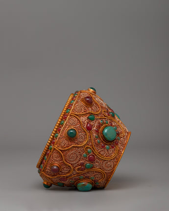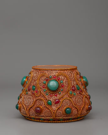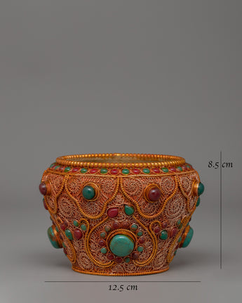 The Tibetan Golpa Bowl with Coral is a meticulously designed object for sacred Buddhist offerings. The item's dimensions are 8.5 cm in height and 12.5 cm in breadth, making it ideal for altar displays and ceremonial use. The bowl, crafted from copper with delicate filigree work, is gold-plated to impart spiritual significance. The bowl is adorned with artificial coral and turquoise stones, representing purity, knowledge, and harmony in Tibetan traditions.