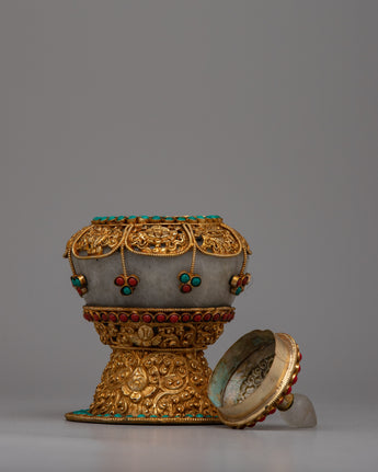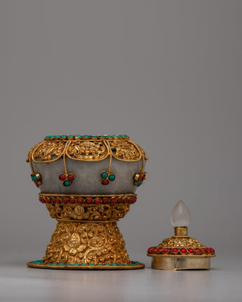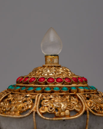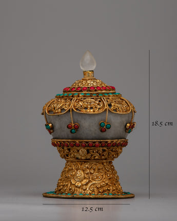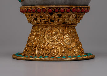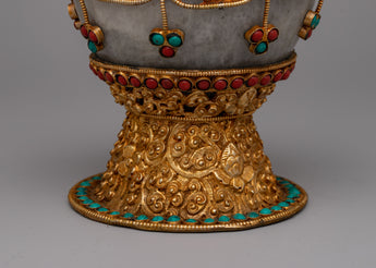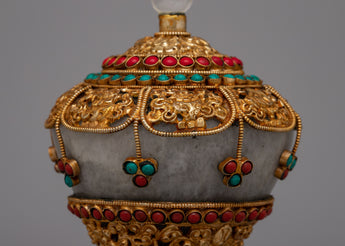 This Copper rice pot is a work of art that captures the rich customs of Tibetan culture and is also useful. Its elaborate design and the use of priceless stones like crystal, coral, and turquoise increase its aesthetic appeal and symbolic meaning. Coral denotes life, turquoise is thought to provide protection, and crystal stands for purity and clarity.