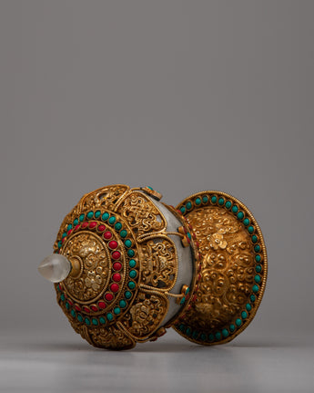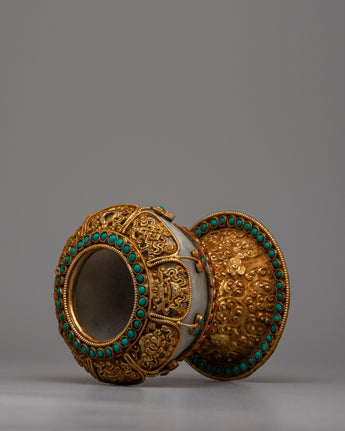 Presenting the Tibetan Traditional Bowl Rice Pot, a stunning blend of fine craftsmanship and cultural history. This gorgeous bowl is handcrafted with a copper body and tastefully electroplated in gold. It is embellished with crystal, turquoise, and coral. It weighs 1.068 kg and measures 18.5 cm in height by 12.5 cm in breadth.