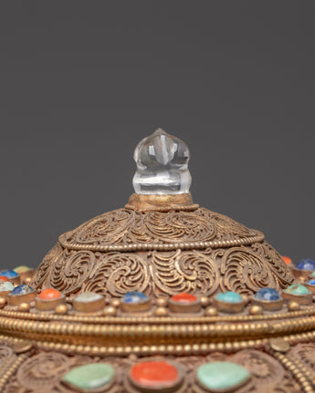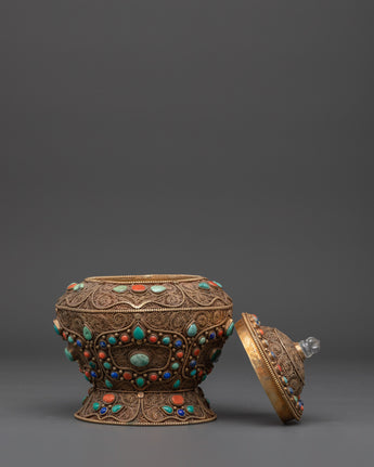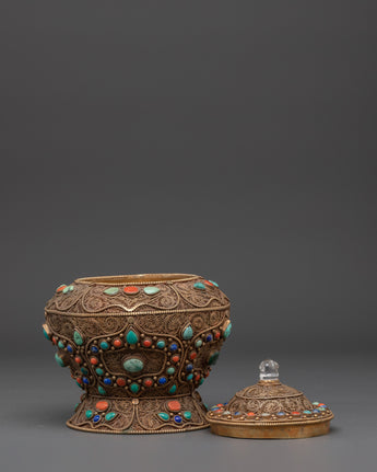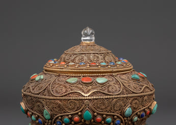 This Traditional handcrafted Tibetan Rice Pot is a fantastic piece of art, designed to enhance your home's decor and create a spiritual sanctuary. This rice pot is meticulously crafted from copper and gold-plated for a rich, elegant finish, featuring delicate filigree work that showcases the artist's extraordinary expertise. The pot is embellished with gorgeous artificial turquoise stones, which offer an authentic touch of Tibetan culture. With its delicate yet significant appearance, this rice pot is excellent for creating a peaceful atmosphere in your meditation room or as a one-of-a-kind centerpiece in your house.
