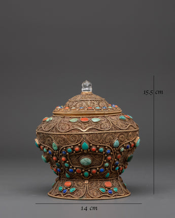 The Traditional Handcrafted Tibetan rice pot measures 15.5 cm in height and 14 cm in width, making it ideal for both display and storage. Weighing only 0.78 kg, it is both lightweight and portable, yet substantial enough to make a lasting impression. This pot is more than just a functional rice storage container; it is also a spiritual artifact with great cultural significance. Its filigree work and turquoise accents represent prosperity and abundance, making it an appropriate addition to your altar or as a decorative item.
