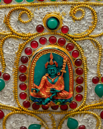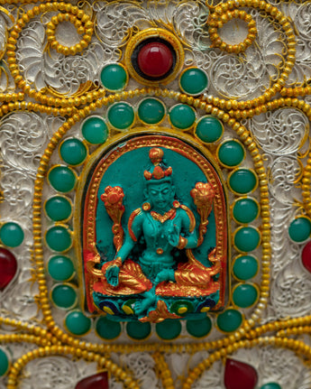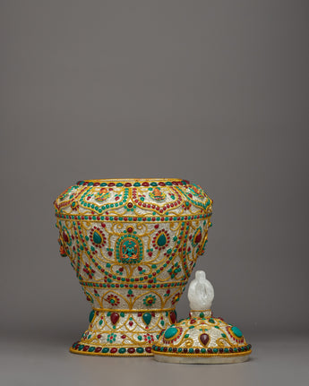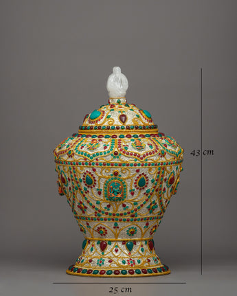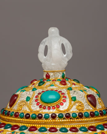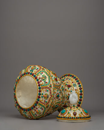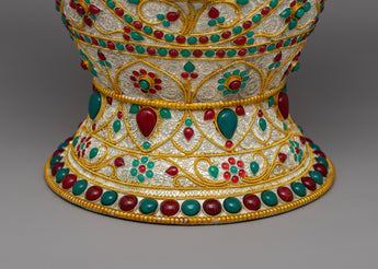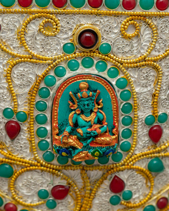 This Traditional Rice Pot is an elegant and detailed piece of copper with silver plating that exemplifies Tibetan art's high level of craftsmanship. The pot's brilliant colors, embellished with artificial stones such as ruby, panna, and turquoise, give spiritual depth and visual attractiveness. Green Tara, Dzambhala, and Guru Rinpoche, the beloved deities of prosperity, wealth, and compassion, are brilliantly represented in the middle of each side of the pot, adding to their spiritual significance.