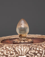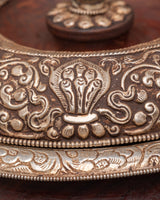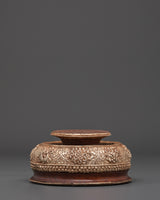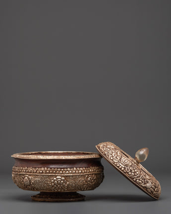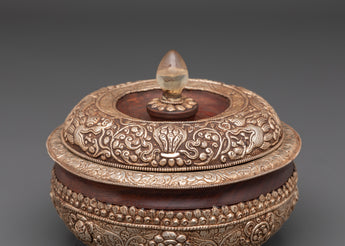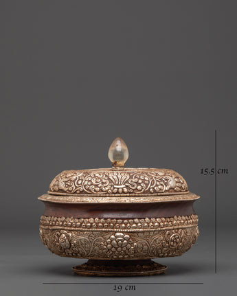 Made with a combination of white metal and wood, the pot showcases expert craftsmanship, blending strength with artistic elegance. The intricate flower carvings symbolize purity, growth, and positive energy, making the vessel not only a ritual object but also a striking decorative piece. Whether used for daily spiritual practice, as a ceremonial offering container, or displayed as cultural art, this rice pot radiates beauty, tradition, and sacred significance.