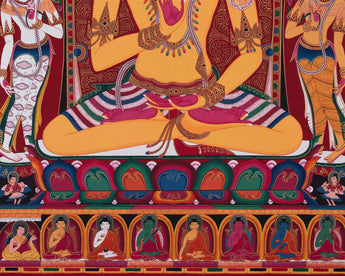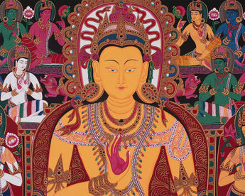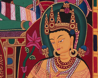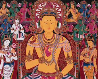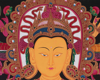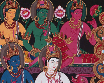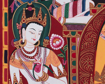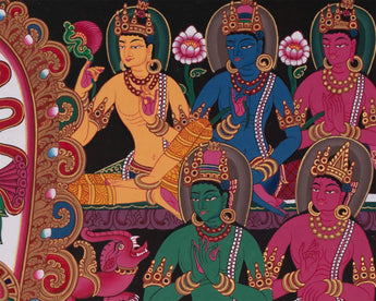 Our thangka is a handpainted Tibetan art done using traditional methods. It is a unique piece created using genuine 24K gold and natural stone colors.