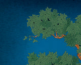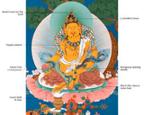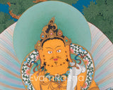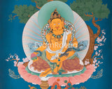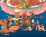 Dzambhala, the Deity of Wealth, is seated with his right leg drawn in and his left leg in the periphery. The thangka print has portrayed him in a blue background with trees and flowers blooming from it. With ritual offerings in front of him, he sits on a lotus seat adorned with Bodhisattva's crown, precious ornaments, and patterned silks. He has a big tummy and His mongoose Nehulay, which he holds in his left hand, is his most distinguishing feature. Nehulay, continuously vomiting jewels represents Dzambhala's conquest of the nagas (snakes). Medical citron fruit in his right hand, which have therapeutic effects such as fever reduction.