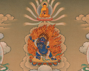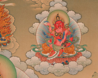 The thangka represents the five Dzambhalas that are the manifestations of the compassion of Buddhas and Bodhisattvas to guide sentient beings along the path to enlightenment.