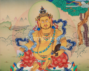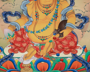 Welcome the blessings of wealth, prosperity, and spiritual balance into your life with this canvas print of Lord Kubera, Dzambhala. Printed on high-quality cotton canvas using the Giclee technique, this artwork captures the original thangka's intricate details and vibrant hues with exceptional clarity and longevity. The imposing yet compassionate demeanor of Dzambhala represents the flow of wealth, promoting both material security and a giving nature. Perfect for meditation spaces, shrines, or as a refined centerpiece in the living space, this thangka print serves as a timeless reminder of the harmony between material wealth and spiritual fulfillment.