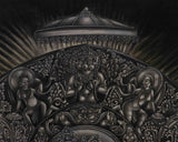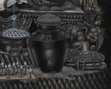 Surrounded by layers of sacred architecture and divine beings, the print becomes a dynamic tapestry of protection, wisdom, and blessings. A butter lamp illuminates ritual offerings of gold vases and gems, drawing the viewer into a space of sacred wealth and spiritual elevation. Ideal for meditation areas, temples, or art collectors, this print brings the protective and prosperous energy of Kubera into any space.