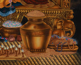 The two-tiered throne beneath him is a symbolic masterpiece, supported by elephants, dragons, and celestial beings. Above him, a radiant halo adds a sense of divine light, while rows of butter lamps glow at the base. Every detail in the Jambhala Canvas Print resembles the depth and texture of an original sacred painting, offering more than visual beauty; it serves as a constant reminder of generosity, inner abundance, and spiritual strength.