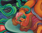 In the traditional Himalayan print, we have artistically depicted the God Of Wealth, Jamnhala. Precious jewels adorn the valuable embellishments, enhancing the print's beauty and significance. Through its use in meditation and yoga practices, this thangka print promises to provide valuable benefits to practitioners. As a gift from Nepal to a discerning practitioner such as yourself, this Buddhist masterpiece will surely be treasured for its exquisite craftsmanship and spiritual power.
