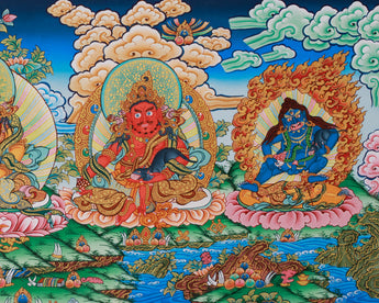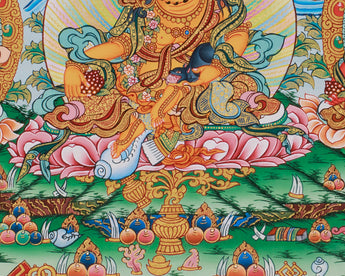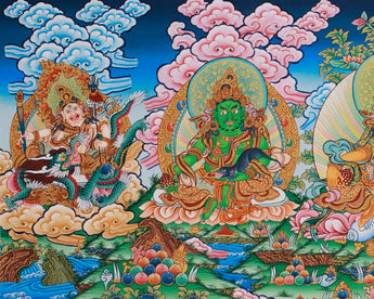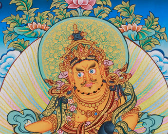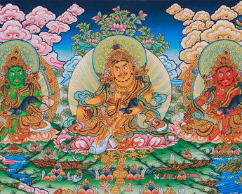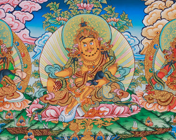 Using genuine 24K gold and acrylic colors, the thangka is meticulously hand-painted on cotton canvas. The intricate details enhance the wealth deities' celestial presence and dynamic energy. Besides serving as a spiritual blessing, this piece embodies elegance and brings prosperity to your home or sacred space with its vibrant colors and golden highlights, emphasizing the significance of each Dzambhala.