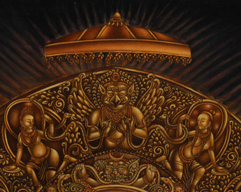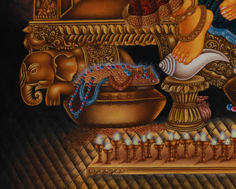 The Throne, a two-tiered symbolic masterpiece with elephants representing strength, dragons representing wisdom, and celestial beings like Nagakanya and Kirtimukha protecting the sacred space. The upper tier features a majestic halo with intricate life-like details, enhancing the thangka's overall realism and divine energy. Every ornament, robe, and golden motif radiates an unparalleled realism, making the entire thangka appear alive with divine energy.