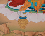 The thangka illustrates Dzambhala, the personification of abundance and wealth. He sits on a moon disc above a lotus throne, with his right leg resting on a conch shell that lies atop a golden treasure vase. His right hand displays a citron fruit in the granting mudra, signifying wealth and fulfillment. In his left hand, he holds a mongoose that emits precious jewels, symbolizing the transformation of greed into generosity. Dzambhala is adorned with intricate jewelry, a crown featuring five precious gems, and a garland of utpala flowers. His fierce yet compassionate expression reflects his protective nature and ability to alleviate financial struggles. As a spiritual guardian, he fosters abundance and promotes generosity, making him a cherished figure to own and revere.