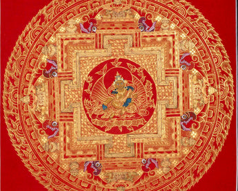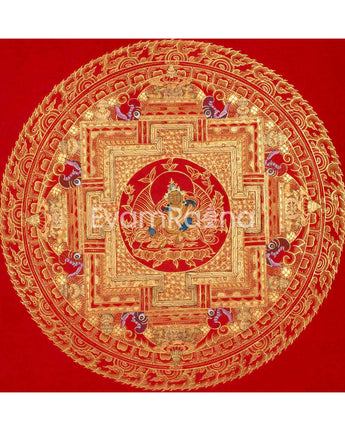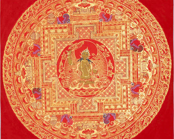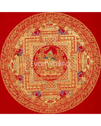 Radiating outward from the central figure, the mandala's intricate patterns and symbols create a visual tapestry of spiritual meaning. Each element within the mandala, from lotus petals to intricate geometric designs, carries profound symbolism, inviting meditation and contemplation.