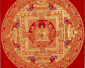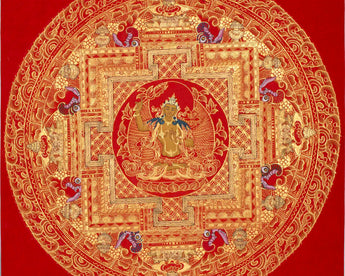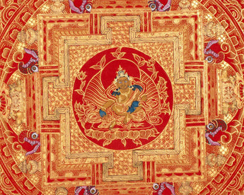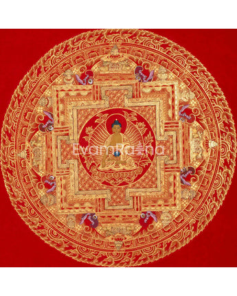 The Deity Mandala in 24k Gold Style is a resplendent masterpiece of divine symbolism and artistry. Crafted with meticulous detail, this mandala features a central deity, often representing the divine essence or a revered Bodhisattva, lavishly gilded with pure 24k gold leaf. The opulent gold exudes a sense of the sacred, emphasizing the deity's spiritual radiance and significance.