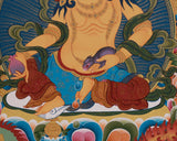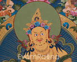 Enhance your spiritual space with this vibrant Five Dzambhala Artwork, a hand-painted Tibetan thangka featuring the five wealth deities - Yellow, White, Black, Green, and Red Dzambhala, in a single sacred composition. This Thangka is hand-painted on cotton canvas, providing a strong sacred framework for the spiritual imagery. The artist expertly mixed rich acrylic colors to create vivid hues and striking contrasts, thereby enhancing the clarity and brilliance of each deity. Genuine 24K gold adorns the thangka, especially in the halos, ornaments, and motifs, creating a radiant beauty that reflects light. This painting, created by a skilled Nepali artist, showcases exceptional artistic quality and profound spiritual dedication, ensuring authenticity in both artwork and symbolism.