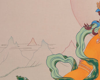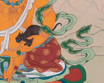 Dzambhala Thangka, often referred to as the God of Abundance, is a significant Tibetan Buddhist artwork that represents the deity of wealth, generosity, and protection. This thangka is hand-painted in the traditional Karma Gadri style, showcasing intricate details and vibrant colors. The artwork is created on high-quality cotton canvas, featuring a sturdy and textured surface that enhances its visual appeal. The artist has emphasized key elements with genuine 24K gold, giving the piece a rich, bright appearance that deepens its spiritual meaning. Acrylic colors vividly bring the image to life, capturing Dzambhala's facial expressions and surrounding success symbols with clarity.