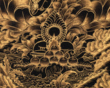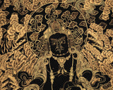 Dzambhala sits gracefully on a lotus base, radiating stability, kindness, and divine authority. A fruit and a mongoose, which symbolize prosperity and the abolition of greed, rest in his palms, demonstrating his ability to bestow infinite wealth upon believers. The golden hues contrast with the black background, symbolizing the transcendence of the earthly realm and the illumination that Dzambhala may bring into the lives of his followers. Whether showcased in a meditation area, on a home altar, or as religious decor, it acts as a powerful reminder of the boundless generosity and abundance that arise from practicing compassion and mindfulness.