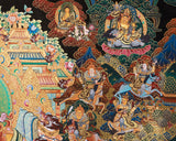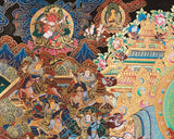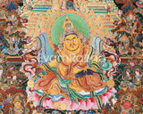 The thangka also features Namtose (Vaisravana) on the left side, Red Dzambhala with his consort on the top right, along with attendant figures, and offering symbols. These additional beings are harmoniously arranged around the central figure, creating a full assembly of divine support and sacred wealth energy. It is a spiritual environment, preserving authentic Buddhist iconography and providing practitioners with a visual portal into his sacred realm of protection, prosperity, and enlightened generosity.
