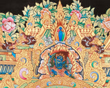 The thangka is characterized by its horizontal composition, creating a scene that feels expansive and richly layered. The lotus base that serves as Dzambhala's seat is elevated and weaved into a magnificent palace structure, adorned with multiple layers of gold, floral patterns, and heavenly motifs. The palace's architectural detail, which is completely painted in dazzling gold, represents his divine kingdom, which is a place of prosperity, harmony, and spiritual fulfillment.