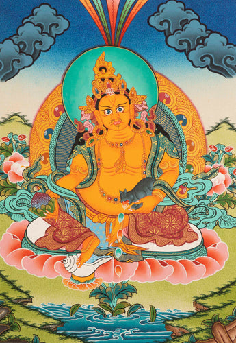 Dzambala sits on a lotus, holding a mongoose named Nehulay, which spews forth precious jewels and ornaments. He is said to be able to grant wishes and help increase financial abundance. Zambala, also known as Kuber is the god of wealth. Zambala or Kubera is also believed to be an emanation of Avalokitesvara or Chenrezig, the Bodhisattva of Compassion. Zambala is the fortune of wealth and prosperity. It is believed that if anyone keeps the painting or statue of Zambala in their home they will be blessed with wealth and prosperity.