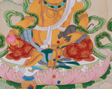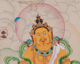 Hand-painted with intricate detail, this thangka of Lord Kubera, god of wealth, radiates spiritual opulence and sacred artistry. Featuring natural stone colors and genuine 24K gold, it's a glowing tribute to the deity's generous abundance. The use of natural stone colors evokes a sense of elemental purity, ensuring the artwork's sacred resonance endures across generations. The 24K gold highlights the divine energy, reflecting Kubera's role as the eternal provider of prosperity. The cotton canvas, revered for its durability and sanctity in Buddhist art, serves as the earthly vessel for the transcendental vision.