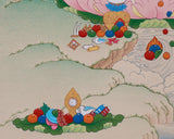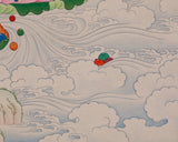 Following the Karma Gadri style, the composition depicts Kubera seated on a blooming lotus throne, surrounded by floating clouds and celestial offerings, symbolizing both grandeur and divine stability. His expression exudes resolute compassion and power, with his gaze direct and his form encircled by radiant auras that signify divine wealth and guardianship. In Tibetan Buddhism, Lord Kubera, also known as Jambhala, is the celestial guardian of wealth and the dispenser of material and spiritual riches. Rooted in both Hindu and Buddhist traditions, he holds a pivotal role as the King of the Yakshas, presiding over prosperity, generosity, and protection from poverty.