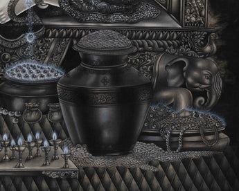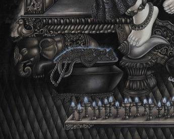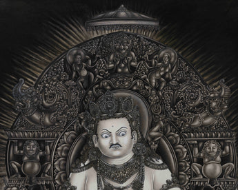 The Paubha thangka features a sacred butter lamp in front of Kubera, illuminating offerings of golden treasure vases, ritual vessels, and jewels. The interplay of light and shadow enhances the three-dimensional realism, making every element appear tactile. The monochromatic palette amplifies the depth and grandeur of the artwork, making it a rare and mesmerizing masterpiece. Every detail, from jewel reflections to flowing textures, embodies Kubera's essence as the divine custodian of wealth and stability.
