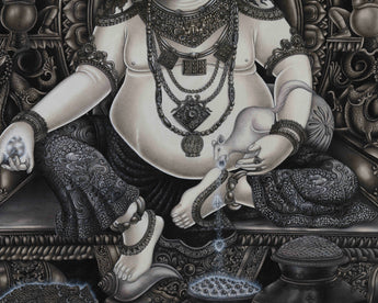 This realistic, monochromatic thangka in the Paubha style depicts Kubera, the God of Wealth, embodying divine power and affluence. Meticulously painted on a deep black canvas, the artwork showcases intricate shading and luminous details that accentuate Kubera's divine attributes and the surrounding symbols. His piercing gaze, characterized by wide, striking eyes, embodies authority and steadfast control over fortune, underscoring his role as the supreme protector of prosperity. An ornate crown, adorned with complex patterns and sacred motifs, rests majestically on his head, signifying his divine position. Elaborate layers of jewelry, necklaces, armlets, anklets, and sacred ornaments, cascade over his luxurious form, each shimmering with a soft glimmer of light, symbolizing the immense wealth he oversees.